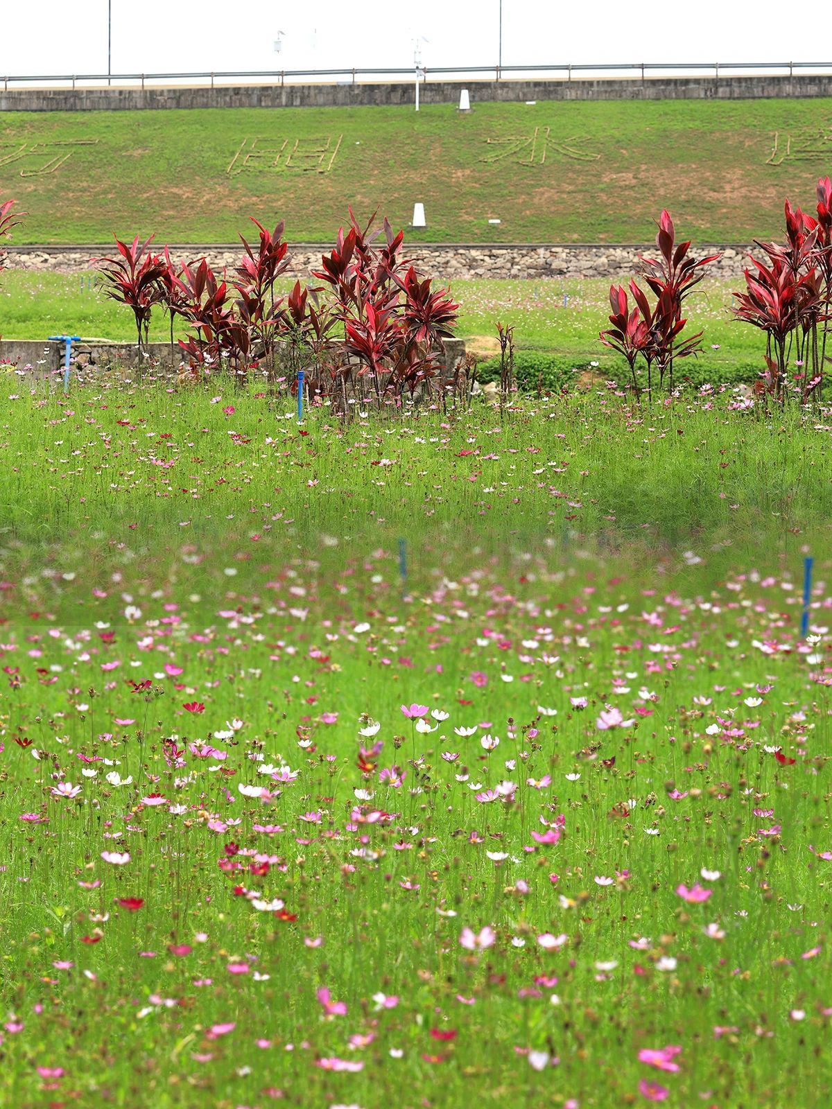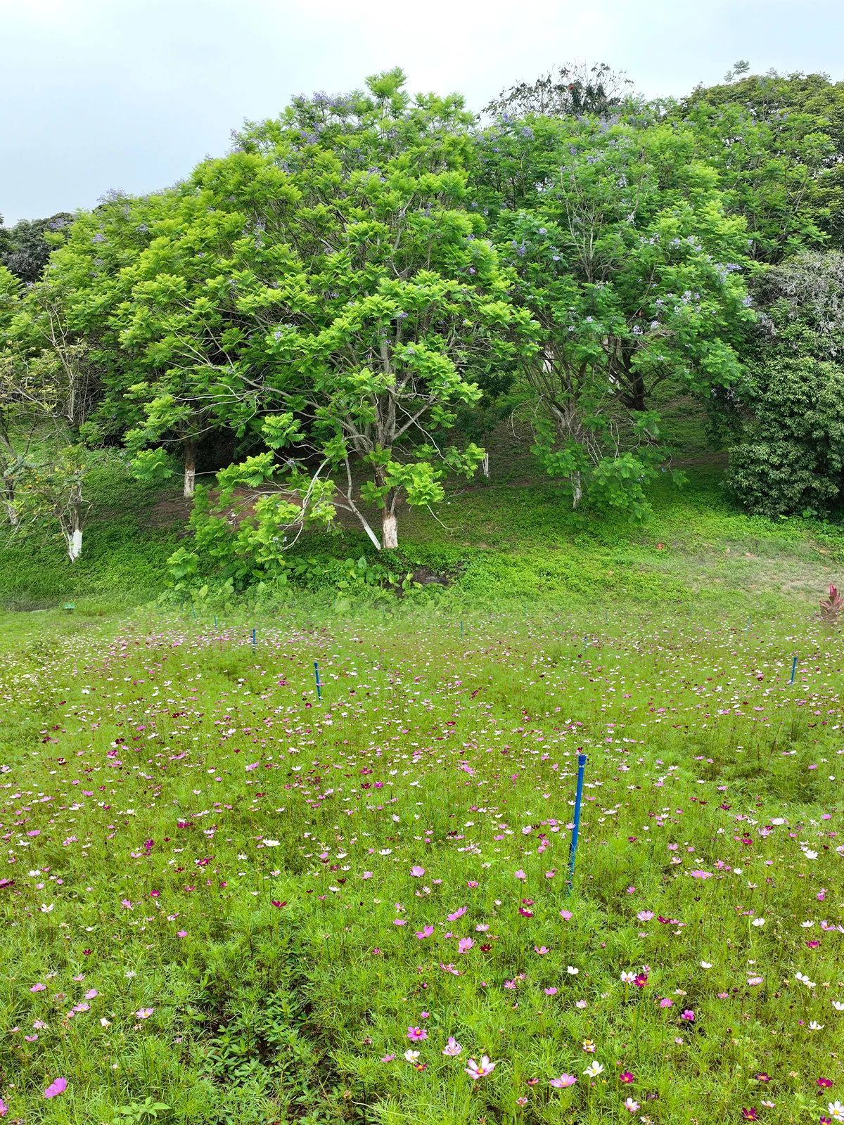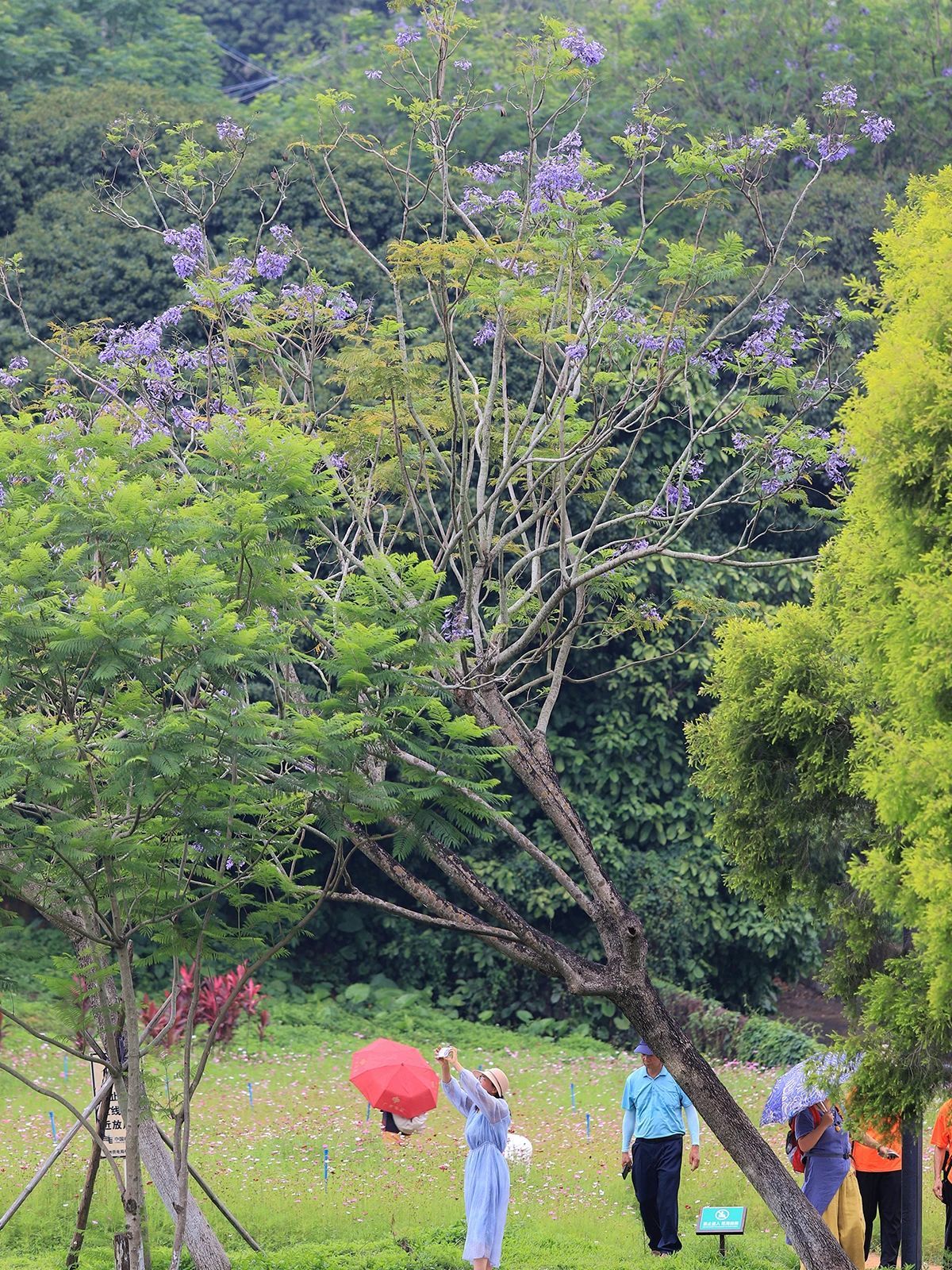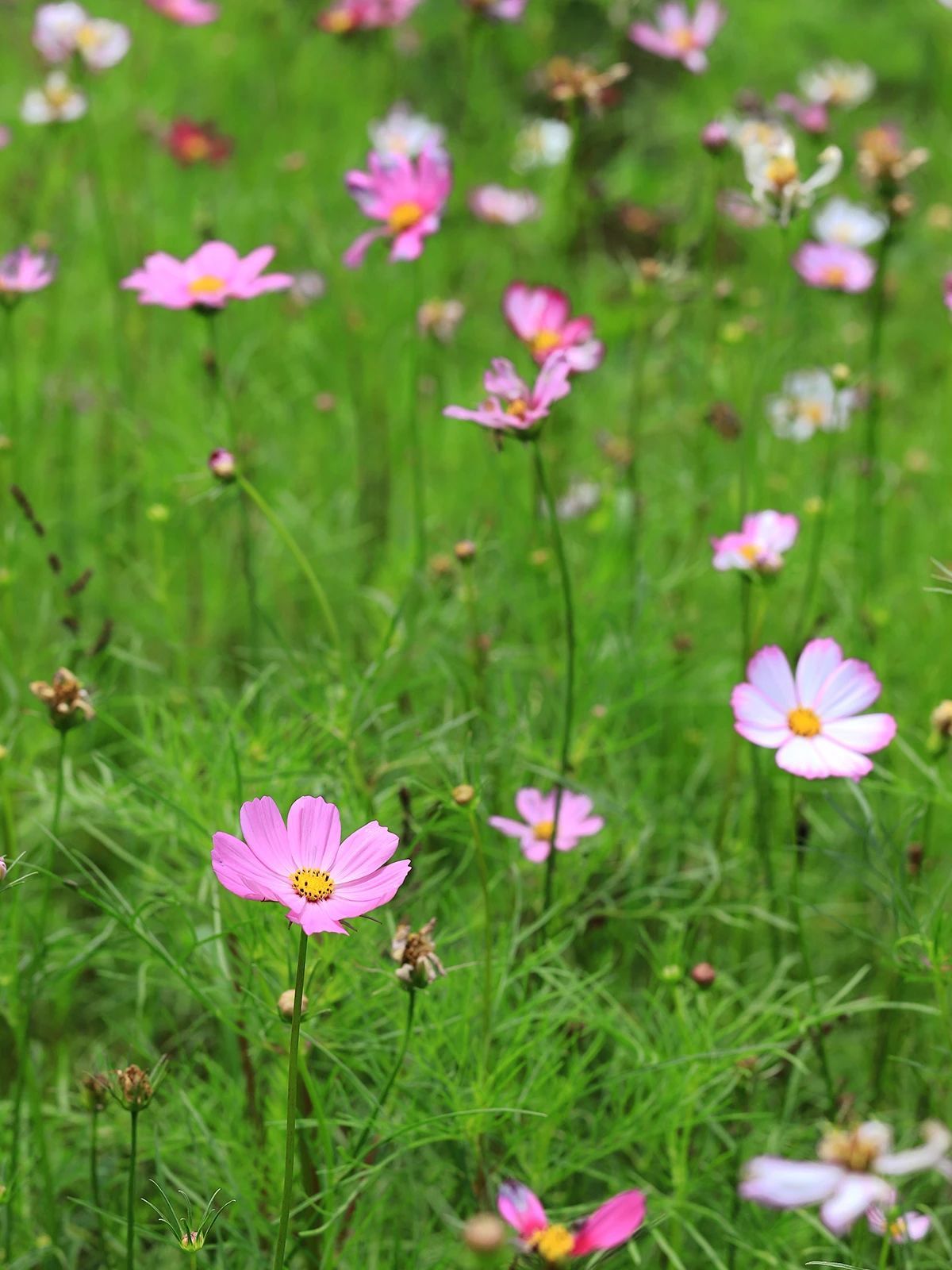白色、浅粉、粉紫色的花瓣随风摇曳